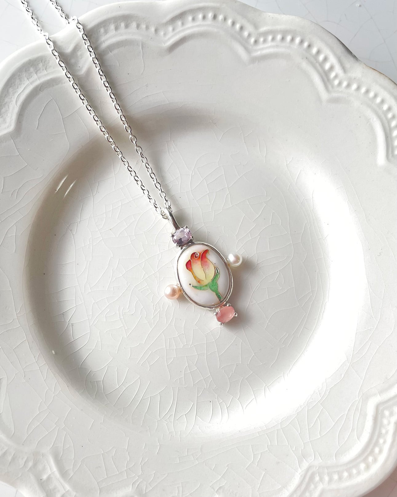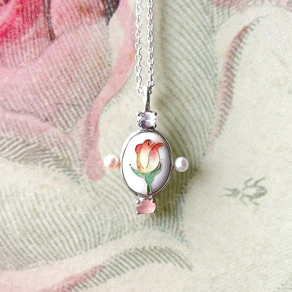 優しい色のピンクトパーズ、ロードクロサイトと二色のパールで囲みました。