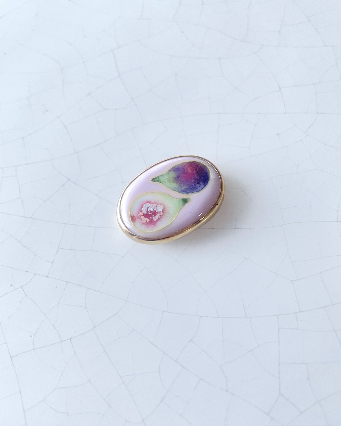 イチジクの実が向かい合わせになったブローチ。