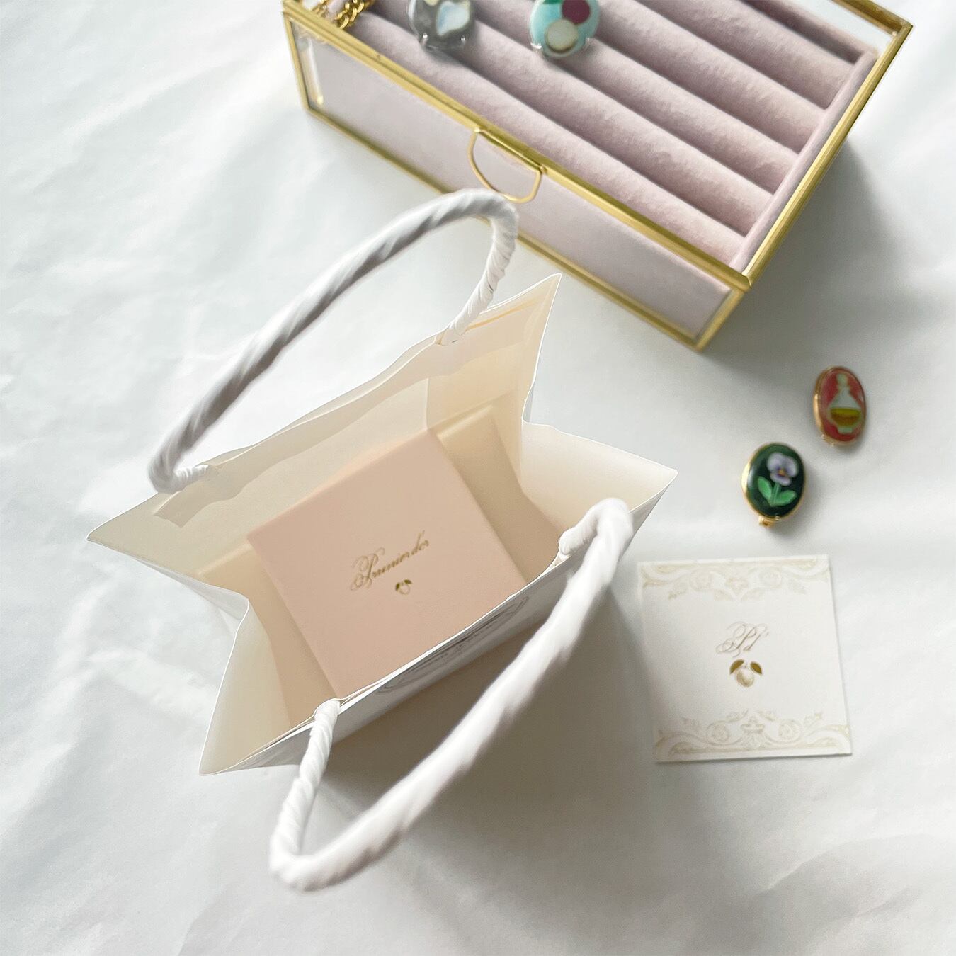 お渡し用の小さな紙袋をご用意しました。 ジュエリーのBOXがぴったり入るサイズで、 まるでフルーツギフトのようなステッカーがポイントです。 大切な方へのプレゼントにご利用ください。 ※画像はプロトタイプ(見本品)です。 サイズ: 幅100×マチ60×高さ120cmm